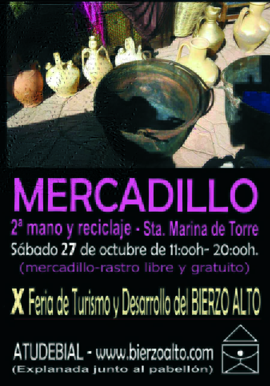 El sábado 27 de octubre vuelve a Santa Marina de Torre la X Feria de Turismo y Desarrollo del Bierzo Alto y el ya habitual Mercadillo de segunda mano y artesanía. El horario será de 9:30 a 22:00 en el pabellón de la localidad y los aledaños.