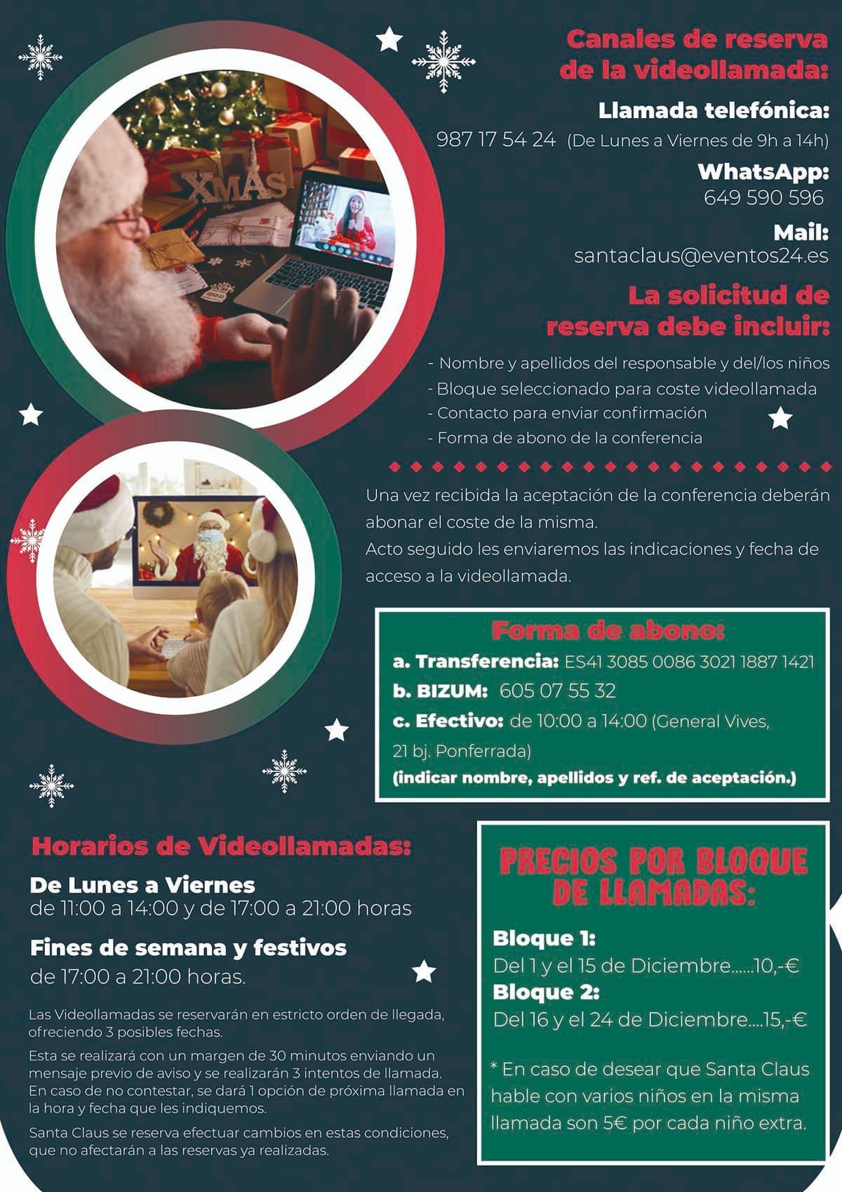 Si quieres que Santa Claus llame a tu casa, contacta cuanto antes con Eventos Veinti4 para reservar fecha y abonar los costes de la conferencia desde el Círculo Polar Ártico. Contacta a través del 987175424, enviando un whatsapp al 649590596 o enviando un email a santaclaus@eventos24.com.